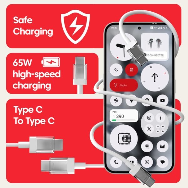 - ✅【65W Super Fast Charging for Maximum Efficiency】: Engineered to deliver up to 65W of blazing-fast charging power, this Nothing Original USB-C to USB-C cable ensures your devices reach full battery in record time. Whether you’re charging a smartphone, tablet, or laptop, its advanced power delivery technology provides stable and safe charging, reducing waiting time and boosting productivity. Perfect for busy professionals, gamers, and travelers.