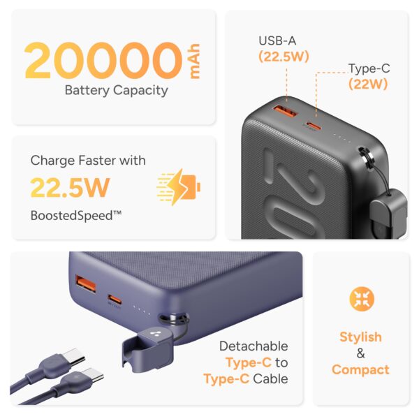 Ambrane 20000mAh Powerbank with in-Build Type C Cable, 22.5W Fast Charging, USB & Type C Output, Power Delivery, Quick Charge for iPhone, Android Mobile & Tablets, Earbuds, (Stylo N20, Purple)