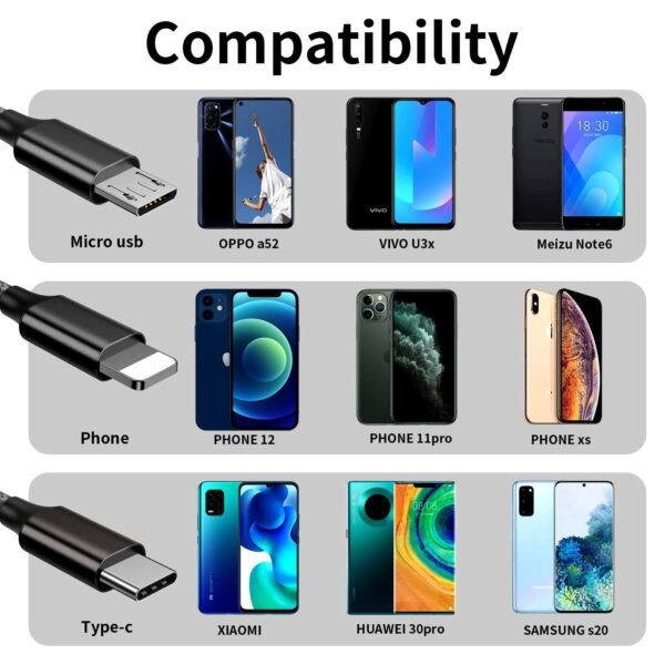 - 3-in-1 Multi Charging Cable: Includes Micro USB and Type-C connectors, compatible with Android, iOS, and Type-C devices for universal charging.