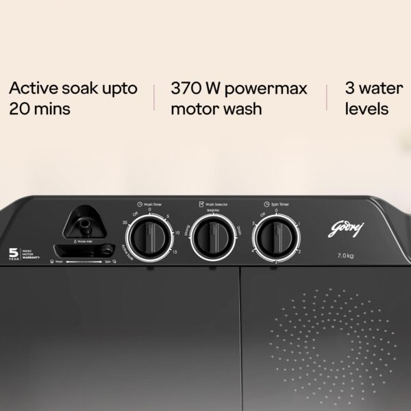 Godrej 7 Kg 5 Star, Active Soak Technology, 370 W PowerMax Wash For Heavy Laundry Wash, Toughened Glass Lid, Semi Automatic Top Load Washing Machine (WS EDGE CLS 70 5.0 PN2 GPGR, Graphite Grey)