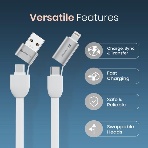Portronics Keylink 4 in 1 Multifunctional Fast Charging Cable With In Built KeyChain, 25cm Length, Tangle Free Flat Cable, Type C to Type C/Lightening, USB A, Fast Data Sync (White)