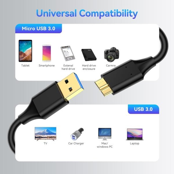 - 🥰High performance Micro USB 3.0 cable connects a portable external USB 3.0 hard drive to a computer for speedy file transfer or synchs and charges Samsung smartphones or tablets equipped with the USB 3.0 Micro-B port, Premium Micro USB 3.0 wire engineered with molded strain relief connectors for durability and grip treads for easy plugging and unplugging. Enjoy SuperSpeed USB 3.0 data transfer rate at up to 5 Gbps, 10x faster than USB 2.0