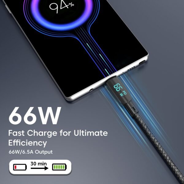 - ✅【66W PD Fast Charging – 6.5A High-Speed Output】: Power up your devices quickly with up to 66W Power Delivery and 6.5A output. This USB-C cable supports rapid charging for smartphones, tablets, and laptops, reducing charging time significantly when used with a compatible fast charger.