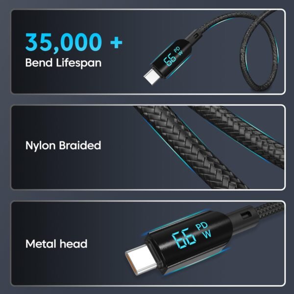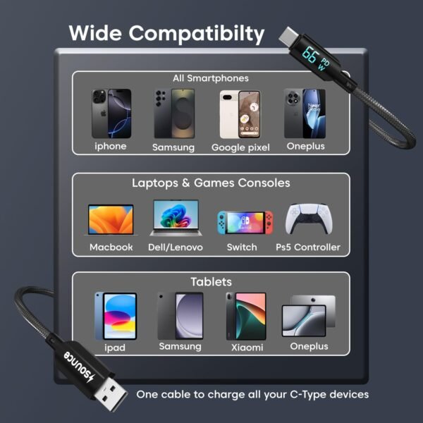 Sounce 66W Type-C Fast Charging Braided Cable 6.5A Output LED Display Real-Time & Tangle-1.2M Length 480Mbps Data Transfer 3.0 Universal Compatible for Phones Tablet Laptop & More (Black)