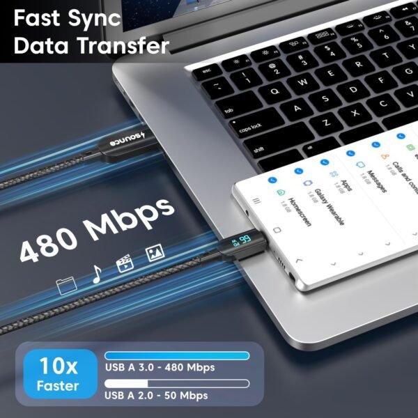 Details: The Sounce 66W USB-A to Type-C Fast Charging Cable is built for users who demand both power and performance, offering ultra-fast charging up to 66W for smartphones, tablets, MacBooks, and other USB-C enabled devices. Whether you’re charging your phone at home, powering your tablet in the office, or topping up your laptop while traveling, this cable ensures efficient energy transfer with built-in safety features to protect your devices from overcharging, overheating, or short circuits. An integrated LED display clearly shows the real-time charging wattage, giving you immediate insights into your charging status without needing to check your device screen. Designed with a tough nylon-braided outer layer and precision metal connectors, it delivers exceptional durability and a tangle-free experience, tested to withstand over 35,000 bends for long-term use. In addition to charging, the cable supports high-speed data transfer at 480Mbps, making file syncing fast and seamless between devices. Measuring 1.2 meters in length, it provides the ideal balance between flexibility and reach, making it a reliable charging companion for everyday use across home, office, car, or on-the-go scenarios.