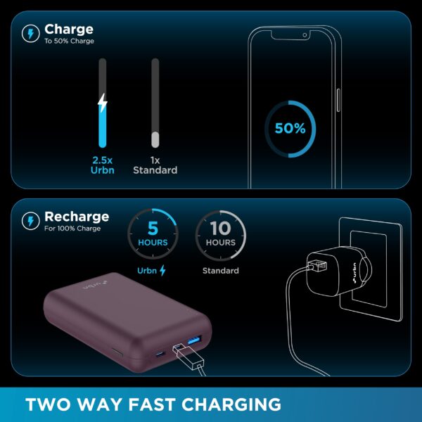 - Two-Way Fast Charge: The URBN 20000 mAh Premium Black Edition Nano Power Bank features two-way fast charging, allowing you to charge your devices and the power bank itself simultaneously. Get the power you need when you need it most.