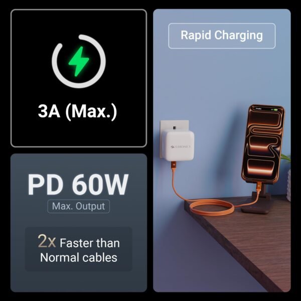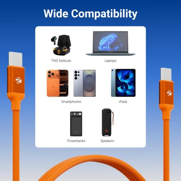 Zebronics Type C – Type C Cable, 60 Watts, Upto 480Mbps Data Sync, Fast Charging, 1 M, Compatible with iPhone 15 & 16 Series, iPad, MacBook, Samsung, Android (Wattz 60CC6, Orange)